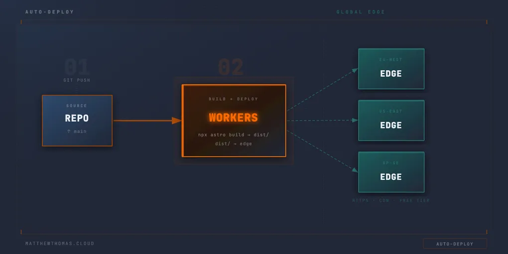 You connect your repository, point it at your build command and output directory, and Cloudflare handles the rest. Every push to your chosen branch triggers a build and deploys the result automatically. No separate pipeline to maintain, no secrets to manage, no deployment step to wire up in GitHub Actions.